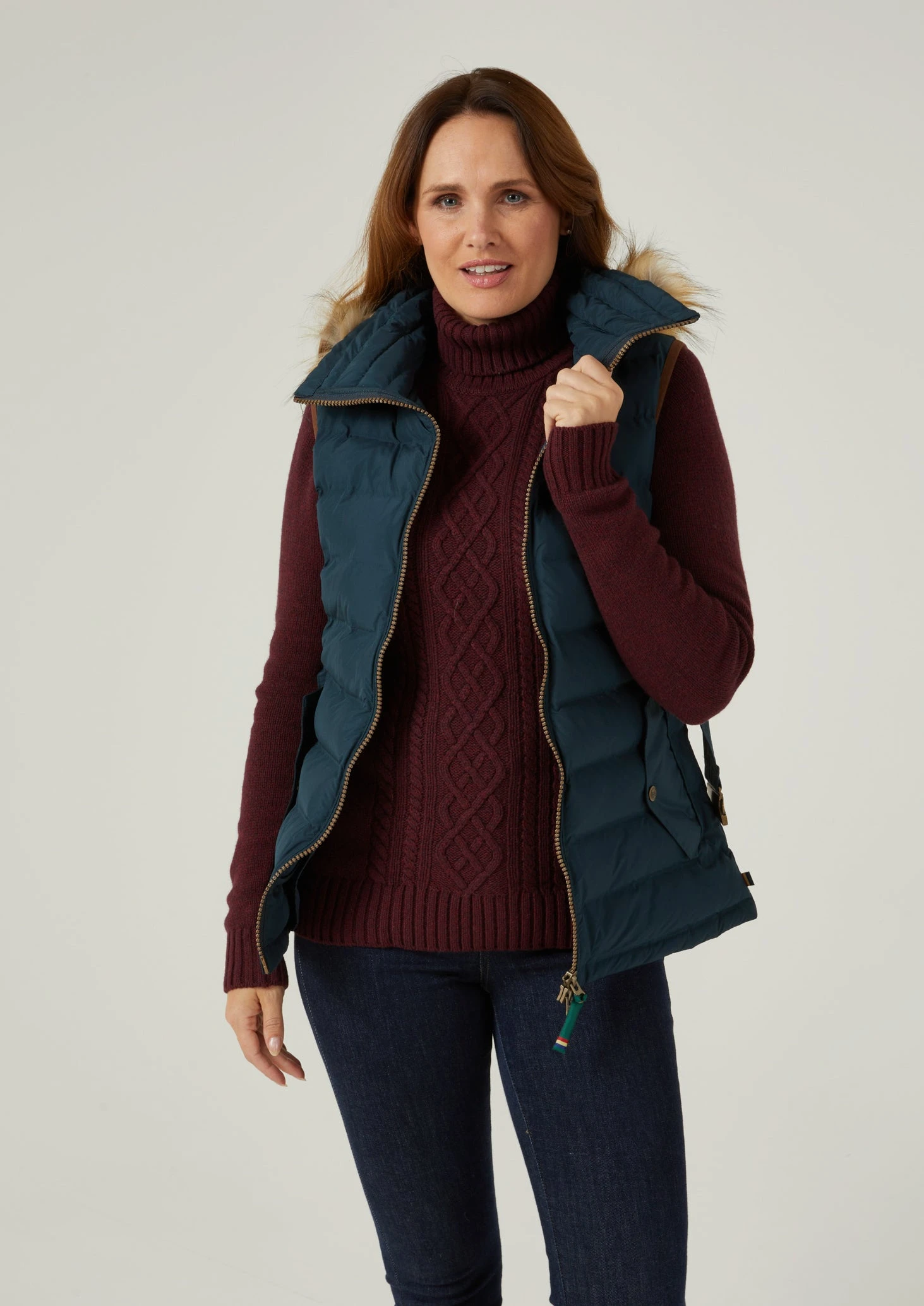 Ladies, welcome to our new Calsall quilted gilet. Pop this on and you’ll feel like you’re having a giant hug without the weight; it’s super light but incredibly warm. It has a water repellent 100% luxuriously soft recycled Polyester outer and contains renewably sourced DuPont® Sorona thermal filling for ultra-lightweight insulation. This fabulous gilet offers so much layering potential. You can adjust the waist for a really comfortable fit, it has a detachable faux fur arctic hood for a lighter option on a warmer day and a two-way zipper so you can open the gilet at the top and bottom.